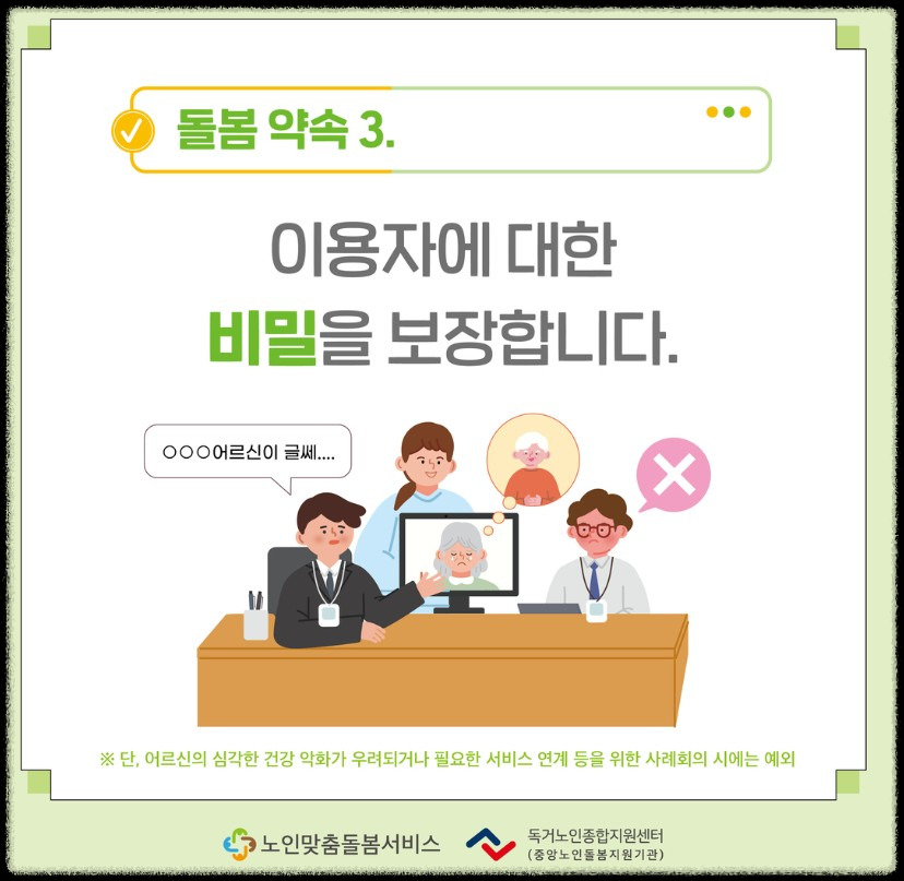 • 어르신의 의견 존중 : 서비스 이용 중 어르신의 의견을 항상 존중하면 효과적인 돌봄이 이루어질 수 있습니다.