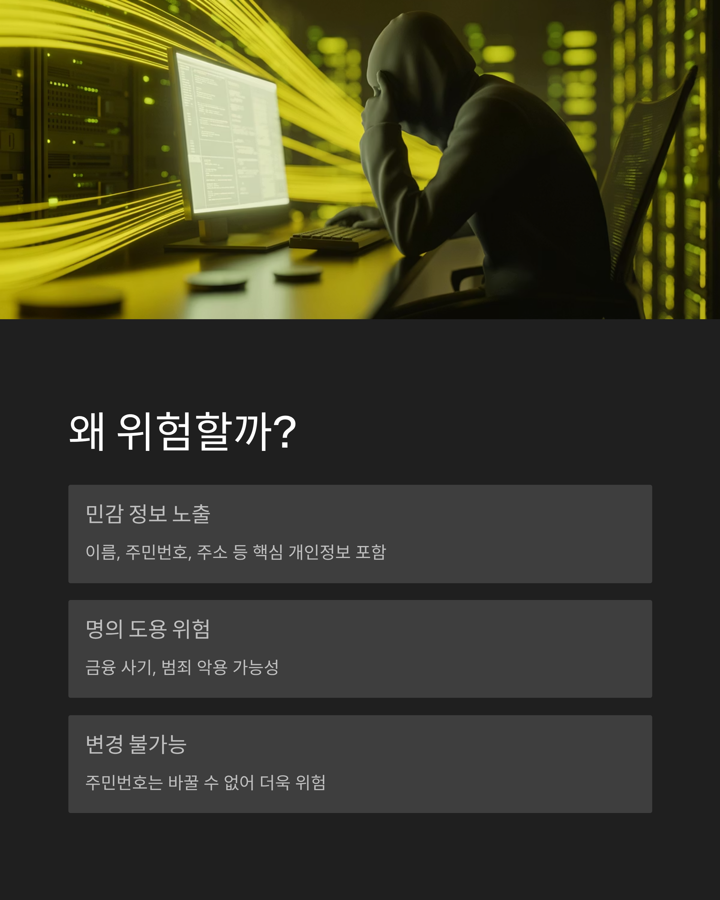신분증 사본에는 이름, 주민등록번호, 주소 등 민감한 개인정보가 담겨 있습니다. 이러한 정보가 유출될 경우 명의 도용, 금융 사기 등 심각한 피해로 이어질 수 있습니다.